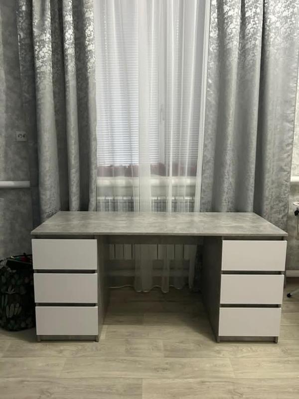 Комп'ютерий стіл 6 ящиків Власне виробництво Перша фотографія це фото-відгук щоб ви розуміли як виглядає вживу Матеріал: ламінова ДСП, товщина 16 мм Розмір: Ширина: 1580 мм Висота: 758 мм Глибина: 600 мм Кольори: Білий Дуб сонома Бетон Венге темний Антрацит Дуб Апалачі Фасади доступні у всіх вищеназваних кольорах, доступні будь-які комбінації кольорів корпусу і фасаду. Доставляємо Новою Поштою по всій Україні у розібраному вигляді ( це зменшує ризик пошкоджень та значно знижує вартість доставки) В комплекті є вся необхідна фурнітура та покрокова інструкція по збірці, всі отвори просверлені.