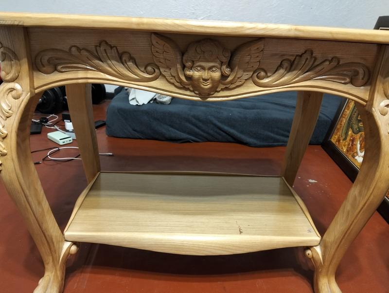 Элегантный деревянный стол ручной работы с резьбой в классическом стиле. Украшен фигурой ангела и изящными узорами. Идеально подходит для гостиной или кабинета. Размеры: ширина 75 см, длина 45 см, высота 60 см.