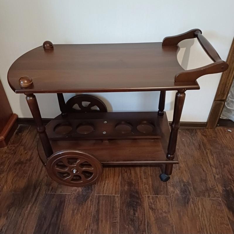 Переїзд, продаю зайві речі.Дерев'яний сервірувальний стіл на коліщатках. Має місця для зберігання посуду та аксесуарів. Практичний та зручний для сервірування та переміщення. Пересилаю у розібраному вигляді. Розміри: ширина 48см, довжина з ручкою 93, висота 63см