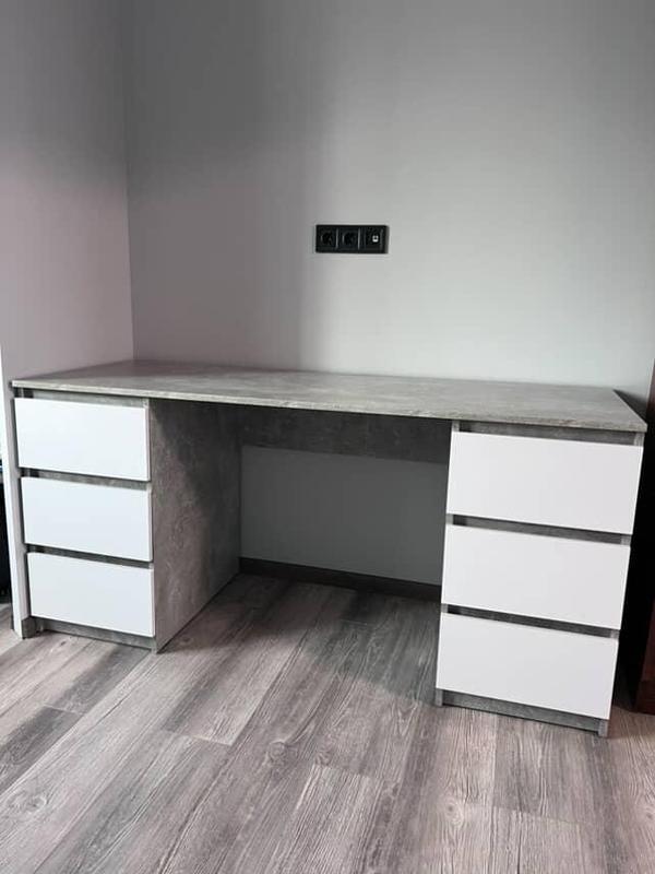 Компьютерный стол 6 ящиков Собственное производство Материал: ламиновая ДСП, толщина 16 мм Размер: Ширина: 1580 мм Высота: 758 мм Глубина: 600 мм Кольори: Белый Дуб сонома Бетон Венге темный Антрацит Дуб Апалачи Фасады доступны во всех вышеназванных цветах, доступны любые комбинации цветов корпуса и фасада. Доставляется Новой Поштой по всей Украине в разобранном виде (это уменьшает риск повреждений и значительно снижает стоимость доставки) В комплекте есть вся необходимая фурнитура и пошаговая инструкция по сборке, все отверстия проскальзаны.