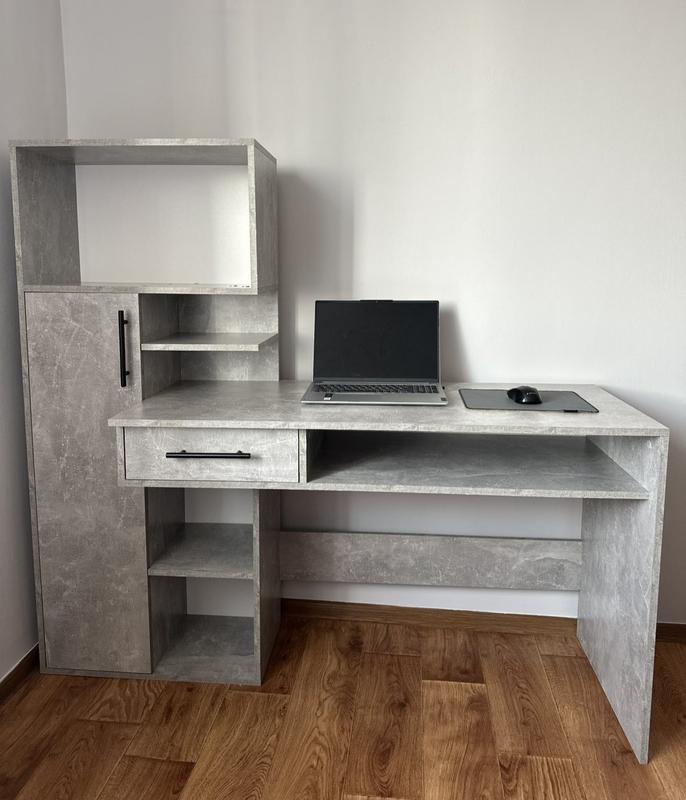 B - 31 Компьютерный стол Собственное производство Материал: ламиновая ДСП, толщина 16 мм Размер: Ширина: 1500 мм Высота: 1390 мм Глубина: 500 мм Кольори: Белый Дуб сонома Бетон Венге темный Антрацит Черный Доставляется Новой Поштой по всей Украине в разобранном виде (это уменьшает риск повреждений и значительно снижает стоимость доставки) В комплекте есть вся необходимая фурнитура и пошаговая инструкция по сборке, все отверстия проскальзаны.