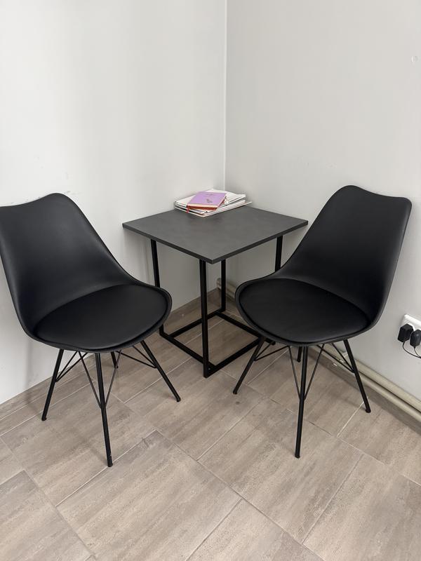 Компактний кутовий столик з двома зручними чорними стільцями. Ідеально підходить для облаштування невеликої зони очікування або відпочинку. Меблі в гарному стані, придатні як для домашнього, так і для офісного використання.