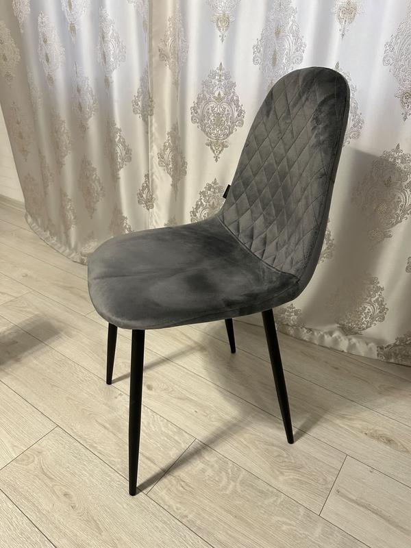 Сидіння стільця оббиті велюровою тканиною. Тканина зносостійка та легка у догляді. Ноги - металеві, вкриті чорною порошковою фарбою. Частини ніг зʼєднані зварюванням та прикріплюються до сидіння гвинтами.