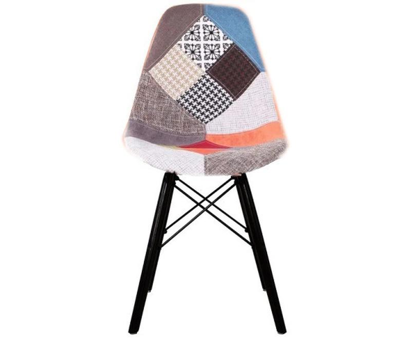 Стілець м'який, тканина в стилі печворк, ніжки дерев'яні, дерево натуральний бук, чорний колір, покриті прозорим акриловим лаком, розмір стільця: ширина сидіння 46 см, глибина сидіння 42 см, висота стільця від пiдлоги до верху спинки 82 см, висота від підлоги до сидіння 43 см. Кількість у коробці 4 од. Цей стілець придумали більше півстоліття тому і він досі залишається одним із найзручніших стільців у світі і саме з нього почалася мода на доступні дизайнерські меблі. Унікальність стільців у стилі Eames – це висока функціональність та універсальність сучасного стилю, що дозволяє використовувати його в абсолютно різних за дизайном та призначенням приміщеннях.