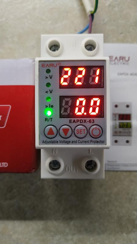 Регулируемое реле защиты от напряжения и тока EARU EAPDX-63. Назначение: Прибор автоматически отключает питание электроприборов при критических скачках напряжения или превышении тока, защищая оборудование от повреждений. Характеристики: Предназначено для однофазных сетей (AC 230 В) с регулируемым номинальным током от 1 до 63 А. Настройки: Значения защиты от перенапряжения, пониженного напряжения и перегрузки по току можно настроить вручную с помощью кнопок на передней панели. Индикация: Цифровой дисплей отображает текущие значения напряжения и тока, а светодиоды индицируют состояние работы (например, горит зеленый индикатор R/T). Применение: Устанавливается на DIN-рейку и подходит для защиты бытовой техники и другого электрооборудования.