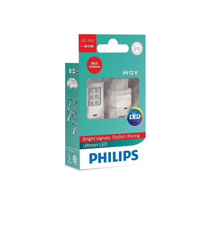 Це світлодіодні лампочки серії Ultinon, від компанії Philips, послужать гарною заміною заводському висвітлення, з поліпшення світловіддачі, при споживанні електроенергії в десять разів менше. Використовуються, в зовнішньому задньому освітленням, для стоп-сигнальних вогнів. При рівномірному розподілі світла і яскравому червоному випромінюванні вони допомагають своєчасно повідомити про свої наміри іншим учасникам дорожнього руху, в уникненні аварійних ситуацій. Чи включаються миттєво, що при великій швидкості руху може мати велику перевагу. Лампочки T20/W21W - без цокольні, роль його виконує патрон, два контакти якого притискаються до провідників. Конструкція вібростійка, з хорошою теплопровідністю, а розміри відповідають посадочних місць. Джерело світла потужні світлодіоди, при невеликих розмірах у них велика потужність і довгий строк служби, при інтенсивному використанні можуть прослужити до восьми років. Вони розташовані там де в галогенних нитка розжарення. При споживаної потужності 0.62 Вт, сила світлового потоку в 80 Лм. Встановлюються в транспортні засоби з напругою бортової мережі 12 В. Головною відмінністю даної серії є підвищена світловіддача, а це яскраве червоне світло. У комплект входить дві лампочки.