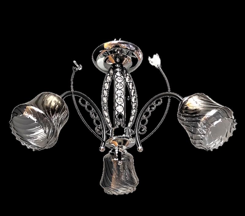 Корпус люстры изготовлен из металла и качественно окрашен в черный матовый цвет с элементами хром. Высота от потолка 46см., в диаметре вся конструкция 60см. Плафоны из стекла, их высота 12,5см., диаметр 12,5см., (экономки не торчат) выглядят красиво! Патроны стандартные е27. Крепится к потолку на планку, диаметр потолочной тарелкки 15см.