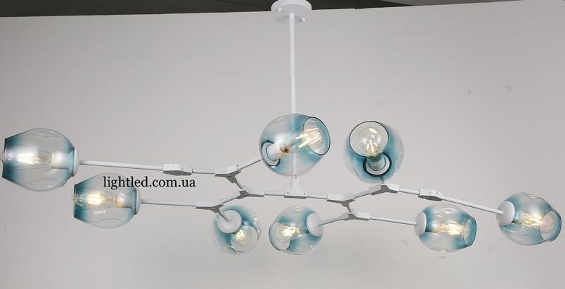 - Материал - металл, стекло - Цвет металла - белый - Цвет стекла - голубо-прозрачный - Источников света - 8 - Лампочек в комплекте - нет - Цоколь патрона - Е27 - Размер - 1200х800х250мм (д/ш/в) - Высота регулируется с помощью ценральной трубочки, которая делится на 20 и 30см - Высота может быть: 25/35/55см - Люстра может видоизменяться с помощью двигающихся трубочек в месте изгиба Интернет-магазин ***************