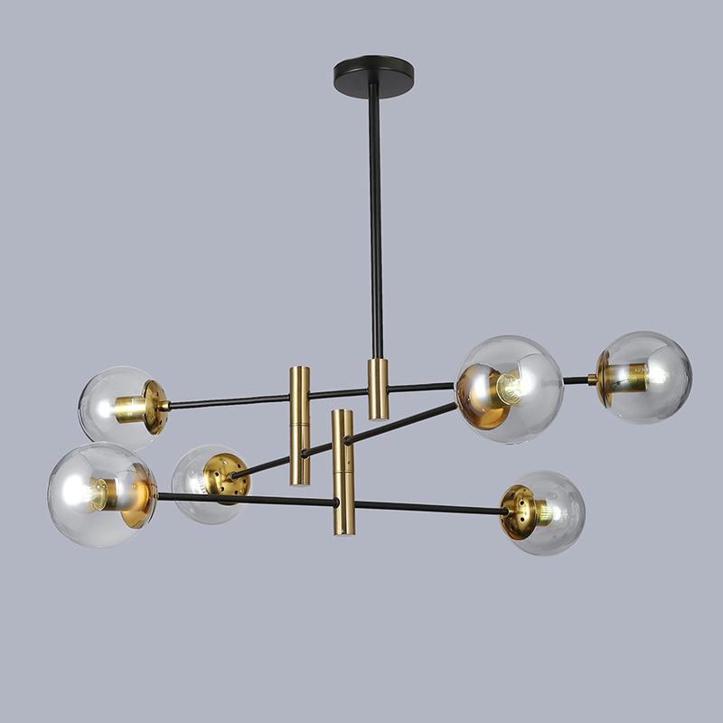 - Материал - металл, стекло - Цвет металла - чёрный - Цвет стекла - прозрачный - Источников света - 6 - Цоколь патрона - Е27 - Диаметр шара - 12см - Потолочное основание - 11,5см - Тип крепления - планка - Размер общий - 850х780мм (ш/в) - Высота регулируется с помощью центральной трубочки, которая делится на 20см и 30см. Можно использовать две трубочки или одну из них. Или не использовать трубочку вообще, чтобы сделать потолочную люстру. - Минимальная высота - 30см - Средняя высота - 50, 60см - Максимальная высота - 78см