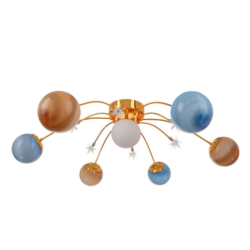 Потолочная люстра BR-01 676S/7 E27 + 6 G4 G это изысканный светильник со стильным, оригинальным дизайном золотого цвета. Модель подойдет для спальни, гостиной, прихожей или зала с современным интерьером. По дизайнерскому замыслу светильник напоминает космическую систему, состоящую из семи круглых плафонов, внешне похожих на различной окраски планеты, перемежающихся шестью небольшими плафончиками-звездочками. Плафоны держатся на дугообразных держателях золотого цвета, соединенных с основанием круглой формы. К потолку светильник крепится с помощью монтажной планки. В качестве источников света используются семь лампочек с цоколем Е27 максимальной мощностью 60 Вт и шесть лампочек с цоколем G4. Люстра предназначена для работы в сети переменного тока с номинальным напряжением 220 В. Уровень защиты корпуса от попадания внутрь пыли и влаги ІР20.