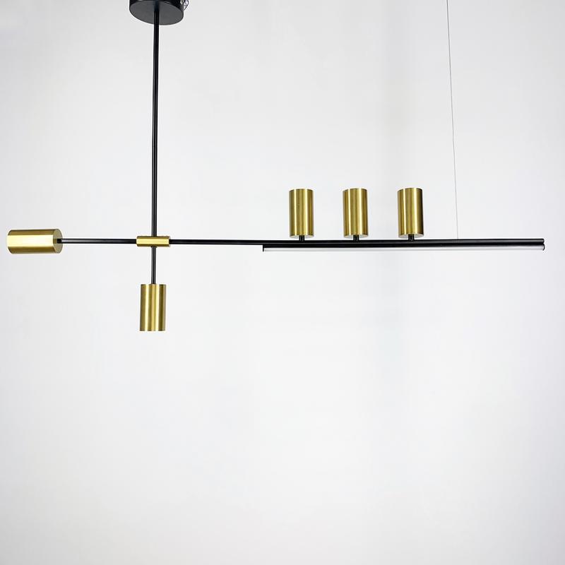 Видовжена дизайнерська люстра Attic в чорному кольорі корпусу з плафонами- спотами кольору латунь Джерелом світла є вбудований LED елемент потужністю 8 Вт та лампочки по 5 Вт (є в комплекті)