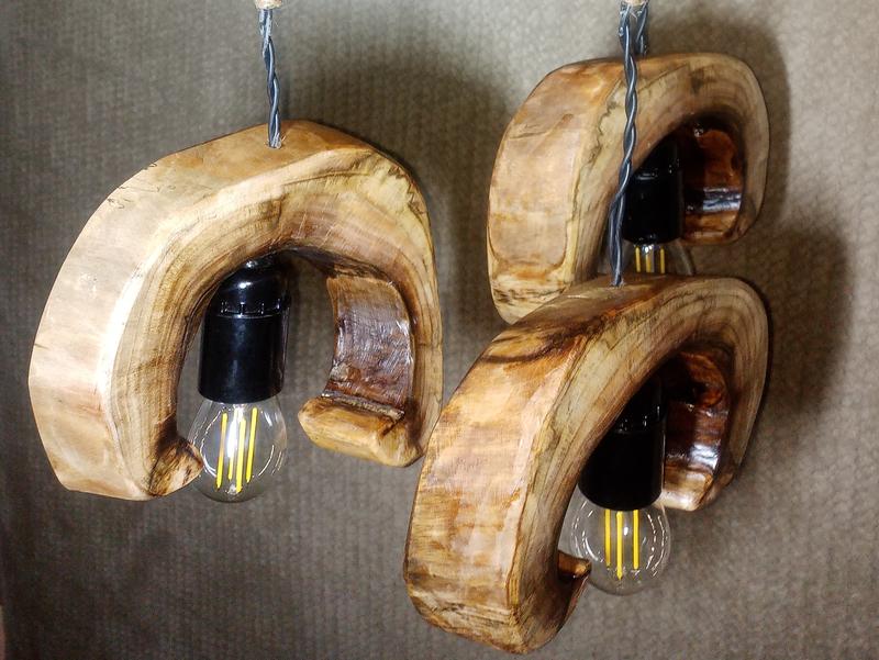 Люстра (потолочный светильник) "Гореховый этюд" Изготовлено из колец старого ореха, поверхность обработана, покрыта лаком, декорировано жгутом, черный витой шнур. На фото представлено в двух вариантах лампочек (филамент LED или светодиодные) Габарити: высота 60см В самой широкой части 35см +/-2см Все кольца имеют неровную, плавную форму легкой спирали. Внешняя часть светлее, внутренняя - гораздо более темный цвет (ореховая особенность). Это придаёт особый шарм и подчеркивает естественность материала. Люстра несколько массивная, но выглядит элегантно. 2000 (с лампами LED) 1900 (с светодиодами)