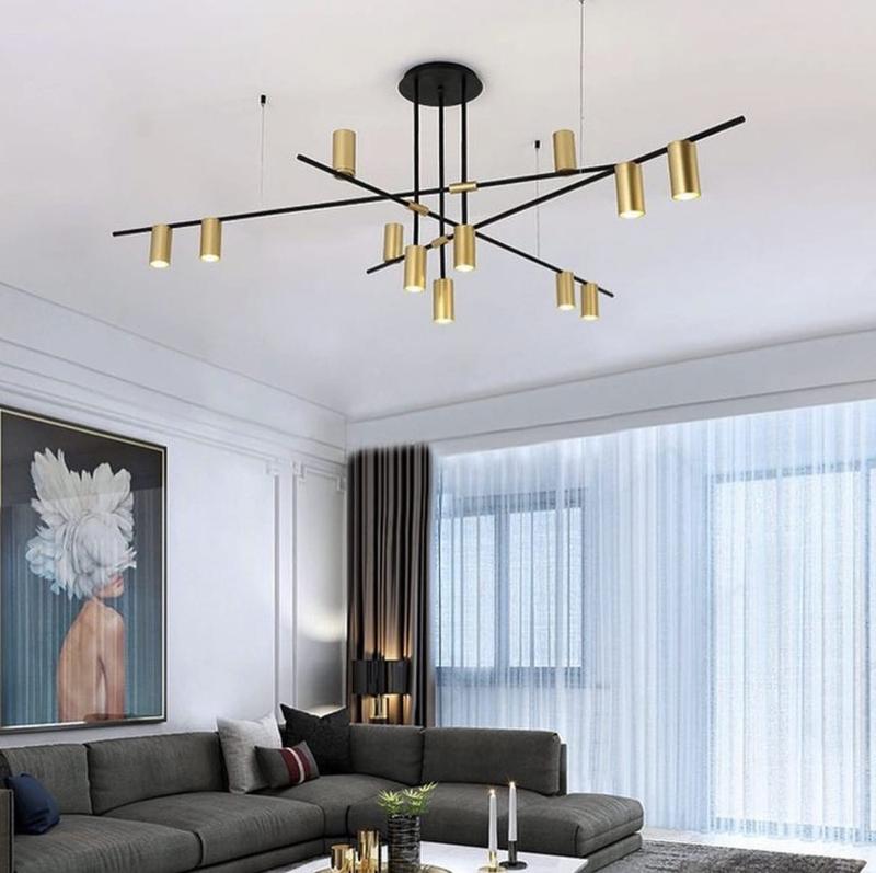 Сучасна лінійна люстра в скандинавському стилі в корпусі метал чорного кольору з плафонами у вигляді спотів чорного кольору або латунь Люстра доступна у декількох розмірах : на 5, 9 , а також 12 ламп