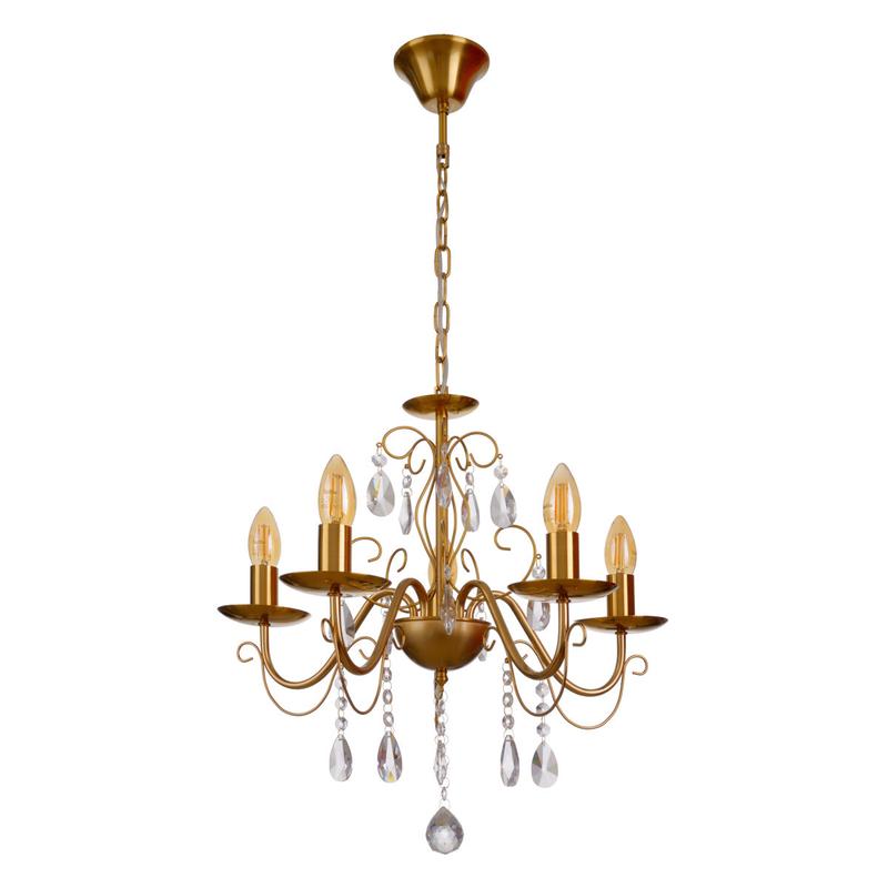 Люстра свеча подвесная на 5 лампочек BCL-734S/5 E14 AB идеально подойдет для освещения гостиных, спален и холлов. Это респектабельная модель с изысканным хрустальным декором. Ее форма напоминает старинный канделябр. Конструкция светильника включает каркас из металла, к которому крепятся держатели с патронами без плафонов и украшения из металла и хрусталя. Покрытие каркаса имеет цвет старинного золота, оно облагораживает светильник и делает его слегка винтажным. Для работы люстры нужны 5 лампочек с цоколем E14 мощностью 40 Вт. Можно использовать светодиодные, энергосберегающие или лампы накаливания. Дизайнеры рекомендуют выбирать для этой модели светодиодные лампочки в форме свечи или свечи на ветру. Высота люстры регулируется с помощью добавления или удаления звеньев цепи. Потолочная люстра отлично сочетается с бра этой же серии артикул 29-284.