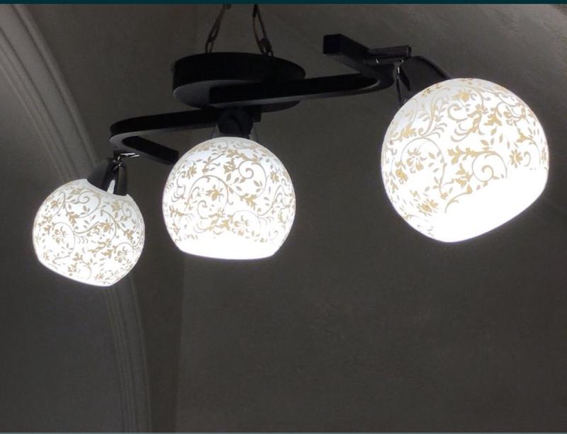 5667/3 люстра новая, цвет черный. Изготовлена из металла Патрон Е14 Плафон белый с золотым рисунком Длина 50см Поворотник серебряного цвета. Высота 15см Диск крепления 13см