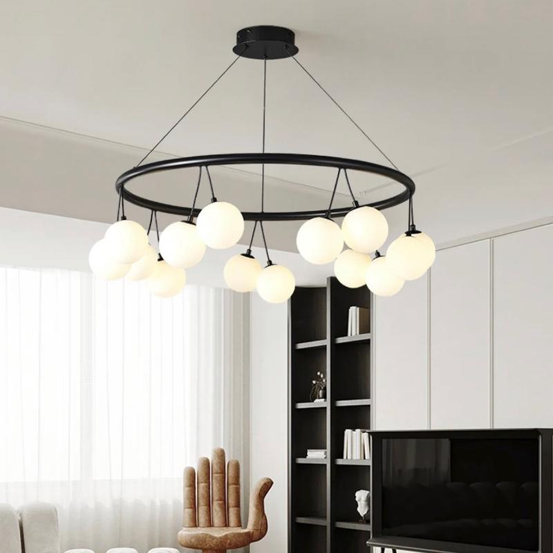 Підвісна люстра-кільце Magic Beans в чорному металевому корпусі з підвісними білими плафонами. Дана модель люстри представлена у двох розмірах, діаметром 60 та 80 см на 10 та 14 плафонів відповідно.