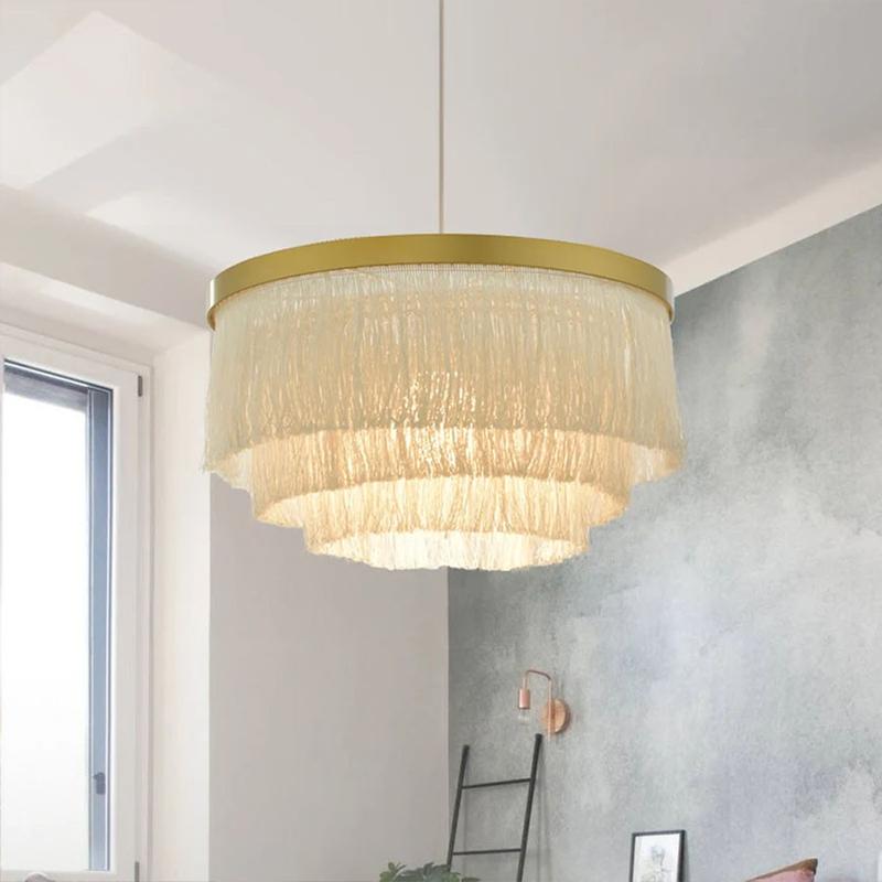 Підвісна люстра в металевому латунному корпусі із 3-ма ярусами підвісних ниток. Модель представлена у 3-х діаметрах: 50 см (висота корпусу 30 см, на 3 лампи), 60 та 80 см.