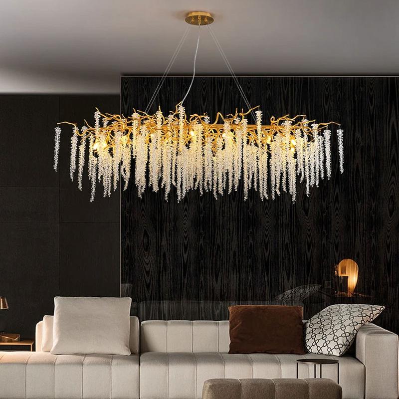 Видовжена вишукана золота люстра із кришталевими підвісами