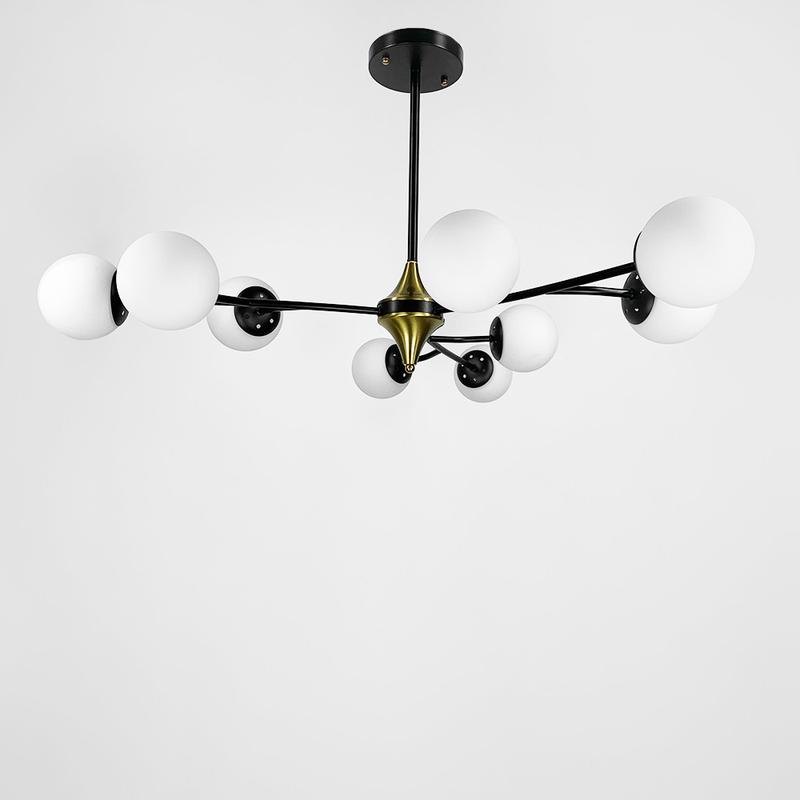 Сучасна модель стельової плафонної люстри доступна у комплектації на 9 (діаметр 89 см) білих плафонів (діаметр плафона 12 см) у чорному металевому корпусі із латунною фурнітурою. Перевагою цієї моделі є поворотні ріжки (гілочки з плафонами), що дозволяє модифікувати люстру під потреби приміщення.
