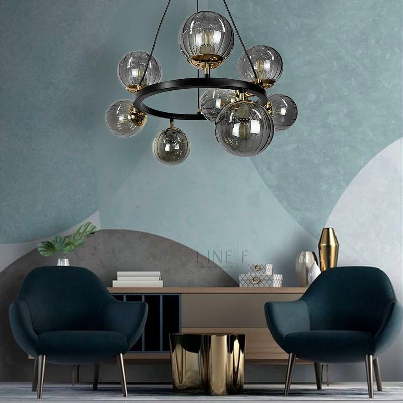 Люстра кругла в чорному металевому корпусі із золотою фурнітурою. Ця модель люстри представлена у трьох кольорах скляного плафона: білий матовий, графітовий та прозорий. Висота люстри регулюється, мінімальна висота оптимпльно до 40 см. Діаметр 60 см (діаметр кільця 37 см)