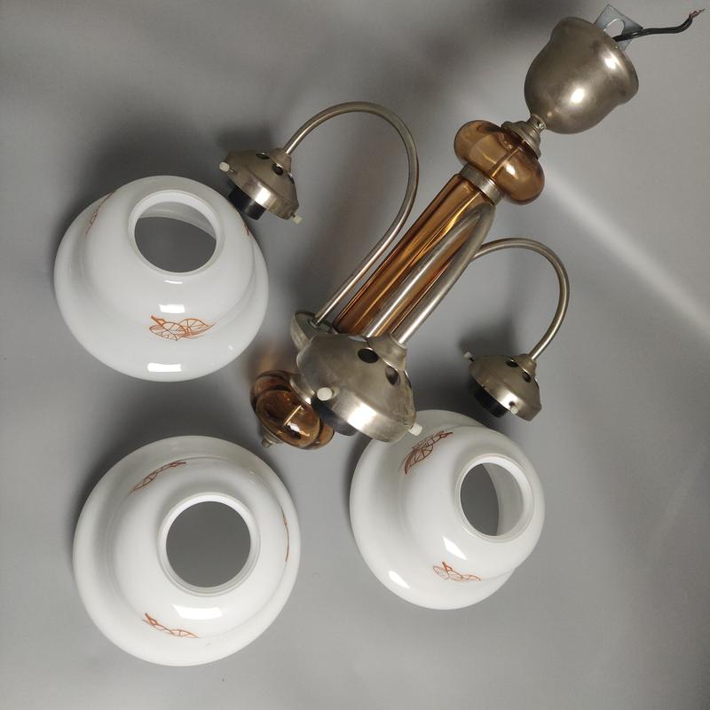 Люстра времен срср Общая высота 45+- На фото можно увидеть несколько сколов и трещин на центральных вставках. Плафоны цели, значительных дефектов отсутствуют. Люстра работает. Все вопросы по состоянию хотим задавать только к покупке...оплата, доставка,Стан предмета отражено на фотографиях. Дополнительные фото по требованию. Отправка в день заказа! Осмотрите также другие Мои объявления!
