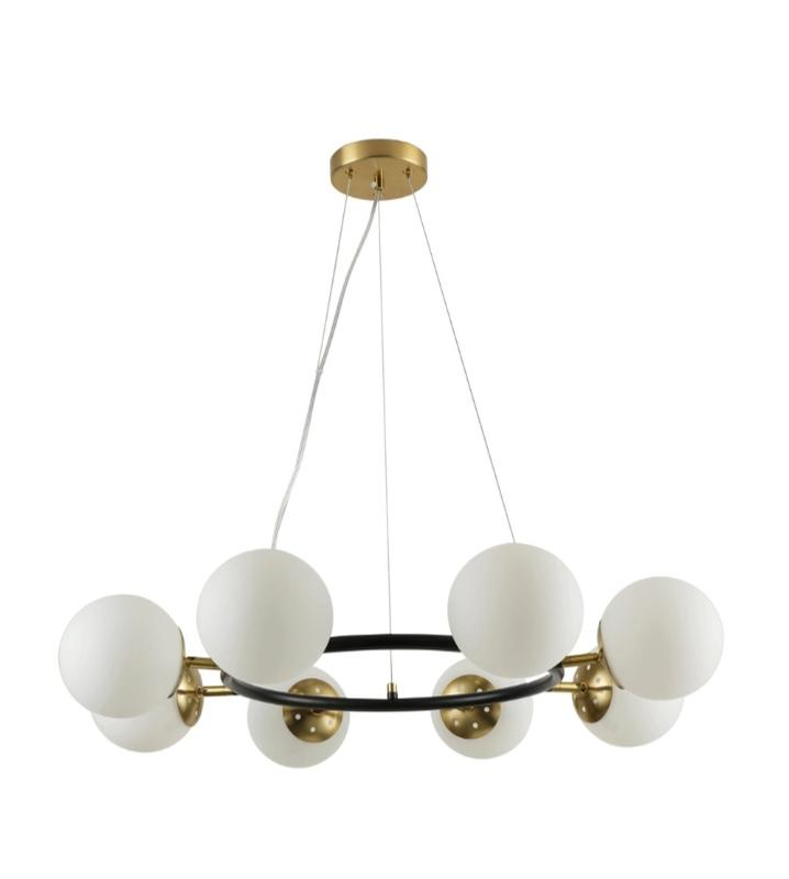 Люстра подвесная "Молекула" Sirius G 74542/8 CP+Matte Black современный дизайн и роскошное освещение для вашего дома. Она привлекает внимание своим оригинальным видом и создает неповторимую атмосферу благодаря мягкому и равномерному освещению. Основные преимущества данной модели: Выполнен из позолоченного и черного матового металла, каркас выглядит стильно и современно, добавляя люстре утонченного блеска. Восемь круглых плафонов: Белые стеклянные плафоны мягко рассеивают свет, создавая комфортную и уютную атмосферу в вашем пространстве. Диаметр 750 мм и высота 850 мм делают люстру оптимальным выбором для просторных комнат, где требуется эффектное освещение. Цоколь E14: Каждый из восьми плафонов поддерживает лампочки до 40 Вт, что обеспечивает достаточное освещение для больших помещений. Люстра подвесная Sirius G 74534/8 CR подойдет для гостиной, спальни или столовой, где она станет яркой деталью интерьера, сочетая стиль и функциональность. Выберите эту люстру, чтобы добавить в свой дом шарма, элегантности и современного дизайна!
