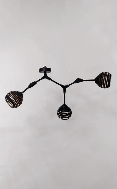 Люстра трансформер молекула в стиле лофт Материал корпуса - металл Цвет корпуса - черный Материал плафона - стекло Тип патрона - E27 Количество ламп - 3 Размеры люстры варьируются в зависимости от направлений и углов наклона шарниров. Габариты люстры в положении на фотографии - 80*40*35 см Размеры плафона - 11*9,5 см --- Пересылаю любой почтой