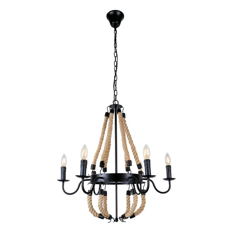 Люстра в стилі лофт 7529366-6 Матеріал - метал+джутовий канат Колір - чорний Розмір - 650*650 мм Висота люстри від 800 мм до 1200 мм (регулюється по висоті) Тип кріплення - стельовий коло Матеріал кріплення - метал Колір кріплення - чорний Джерело світла - 6 ламп Е27 Максимальна потужність лампочки - 60 W Можливість використання лампи LED, світлодіодна енергозберігаюча.