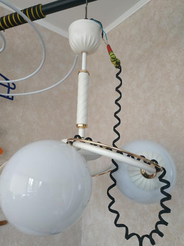 Люстра 3 лампи. Диаметр плафона 13 см, диаметр для лампочки 4 см, не каждая лампочка подойдет, только продолговатые, можно подключить отдельно одну, или две, если позволяет выключатель. Крепление люстры на крючок.