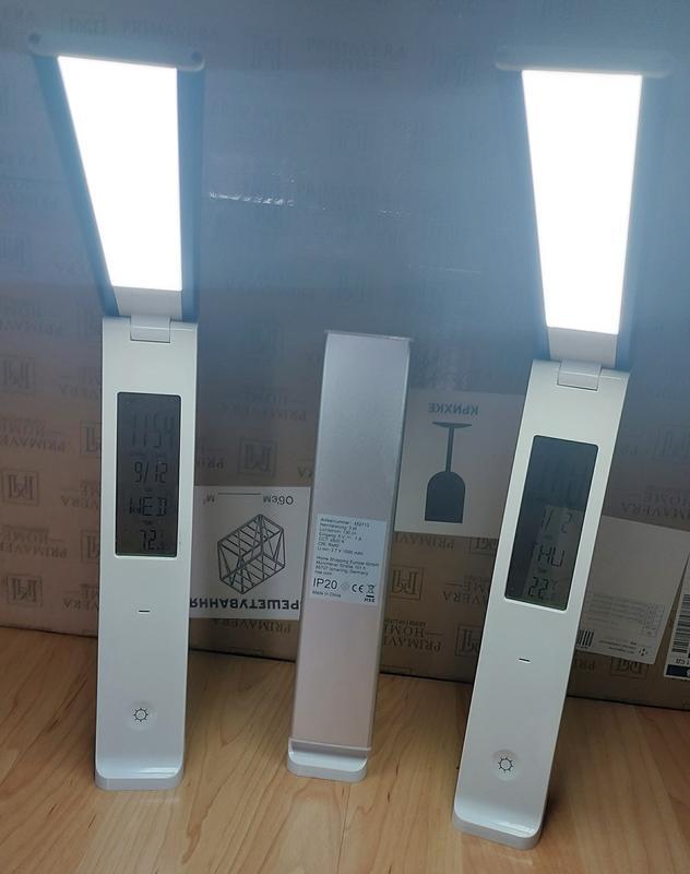 Виробник: Інший виробник Тип лампи: Світлодіодні Тип: Настільні лампи Настільна лампа, ліхтар, світильник на світлодіодах з акумуляторною батареєю з зарядкою на USB. Дісплей показує дату, рік, температуру, є будильник. Габаритні розміри 32*5*4 см в згорнутому стані. В вертикальному розгорнутому стані 50см висотою. Зарядки тримає на 6 годин. Три положення яскравості. Можлива оптова знижки ціни від 10шт.