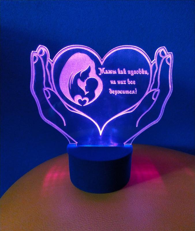 3d-светильник Мамы пуговки, 3д-ночник, несколько подсветок (батарейка+220В) . . 3D-светильник - оптическая иллюзия, когда свет заставляет плоскую пластину с нанесенным рисунком, казаться объемной. Свет, создающий настроение! Пластина с рисунком съемная, что позволяет заменять рисунки по настроению одним легким движением. Страна производитель Украина Гарантия 6 месяцев на электронику Взаимозаменяемость пластин с рисунком Да Размеры светильника Высота - 17 см Ширина - 18 см Толщина акриловой пластины с рисунком 4 мм Количество подсветок 7 цветов подсветки (красный, синий, зеленый, желтый, голубой, фиолетовый, белый) Питание - 1 батарейка крона 9V (в комплекте) - сеть 220В (сетевой шнур в комплекте) Выключатель 3 кнопки на нижней части подставки (В зависимости от комбинации их включения выбирается цвет подсветки. Красный, синий, зеленый - включить одну кнопку. Желтый, голубой, фиолетовый - включить одновременно 2 кнопки. Белый - включить одновременно все три кнопки) Тип лампы Светодиодная (LED) Режим автосмены цветов Нет Комплектация База (корпус), пластина с рисунком, 1 батарейка крона 9V, сетевой шнур, инструкция на русском языке. Причины для покупки 3D-светильника * 3Д-ночник создаст идеальное мягкое освещение в комнате, гостиной или спальне. * 3D-светильник позволит существенно сэкономить электроэнергию, когда смотришь телевизор или отдыхаешь. * Ночник 3d создаст романтическую атмосферу в спальне или гостиной, заменив опасные свечи. * Ночник 3д позволит ребенку, который боится темноты, спокойно оставаться самому в комнате и засыпать. Любимый герой станет настоящим другом ребенка, добавив детской комнате уюта и теплоты. * 3d-светильник станет отличным декором для любого «детского» или «взрослого» интерьера. * Возможность выбора любимого цвета делает ночник максимально функциональным. * Приятный на ощупь пластик корпуса (базы) усилит тактильные ощущения. Поверхность легко моется и не затирается. * 3д-ночник станет отличным подарком ребенку или взрослому, стильным и полезным одновременно. * Светильник 3д не займет много места на столе или полке, учитывая его плоскую конструкцию.