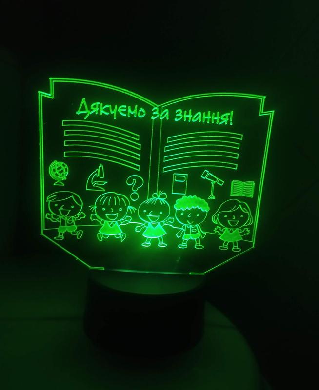 3d-светильник Спасибо за знания, 3д-ночник, несколько подсветок (на пульте), подарок учителю учительнице . . 3D-светильник - оптическая иллюзия, когда свет заставляет плоскую пластину с нанесенным рисунком, казаться объемной. Свет, создающий настроение! Пластина с рисунком съемная, что позволяет заменять рисунки по настроению одним легким движением. Страна производитель Украина Гарантия 6 месяцев на электронику Взаимозаменяемость пластин с рисунком Да Размеры светильника Высота - 165 см Ширина - 180 см Толщина акриловой пластины с рисунком 4 мм Количество подсветок 20 цветов подсветки Питание - 1 батарейка крона 9V (НЕТ в комплекте) - сеть 220В (сетевой шнур в комплекте) Включение, управление, выключение Пульт Тип лампы Светодиодная (LED) Режим автосмены цветов 4 режима Скорость мерцания регулируется Яркость свечения регулируется Комплектация База (корпус), пластина с рисунком, пульт, сетевой шнур, инструкция на русском языке. Причины для покупки 3D-светильника * 3Д-ночник создаст идеальное мягкое освещение в комнате, гостиной или спальне. * 3D-светильник позволит существенно сэкономить электроэнергию, когда смотришь телевизор или отдыхаешь. * Ночник 3d создаст романтическую атмосферу в спальне или гостиной, заменив опасные свечи. * Ночник 3д позволит ребенку, который боится темноты, спокойно оставаться самому в комнате и засыпать. Любимый герой станет настоящим другом ребенка, добавив детской комнате уюта и теплоты. * 3d-светильник станет отличным декором для любого «детского» или «взрослого» интерьера. * Возможность выбора любимого цвета делает ночник максимально функциональным. * Приятный на ощупь пластик корпуса (базы) усилит тактильные ощущения. Поверхность легко моется и не затирается. * 3д-ночник станет отличным подарком ребенку или взрослому, стильным и полезным одновременно. * Светильник 3д не займет много места на столе или полке, учитывая его плоскую конструкцию.