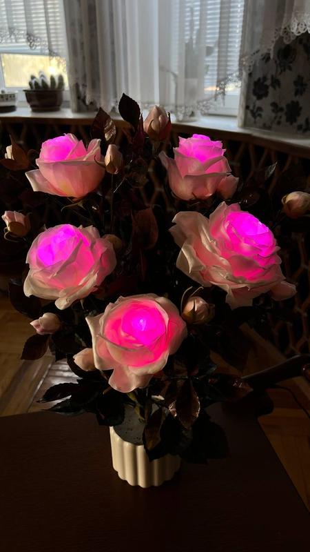Освітіть свій простір елегантністю за допомогою цієї світлодіодної лампи-троянди, що світиться, з п'ятьма гарно виготовленими штучними трояндами, що випромінюють м'яке, романтичне сяйво. Ідеально підходить для прикрашання вашого дому або як продуманий подарунок для особливих подій. Основні характеристики: Джерело живлення: 220 В змінного струму (європейський стандарт вилки) Споживана потужність: 12 Вт Розміри: Висота – 50 см (19,7 дюйма), Ширина – 25 см (9,8 дюйма) Дизайн: П'ять сяючих головок троянд з теплим світлодіодним освітленням Використання: Ідеально підходить для спалень, віталень, весіль, річниць або як унікальний подарунок для неї Догляд: Протирайте сухою ганчіркою або використовуйте холодне повітря з фена для видалення пилу Чому вам сподобається: Додає романтичної атмосфери до будь-якої кімнати Енергоефективний та довговічний Не потрібні батарейки – просто підключіть та насолоджуйтесь