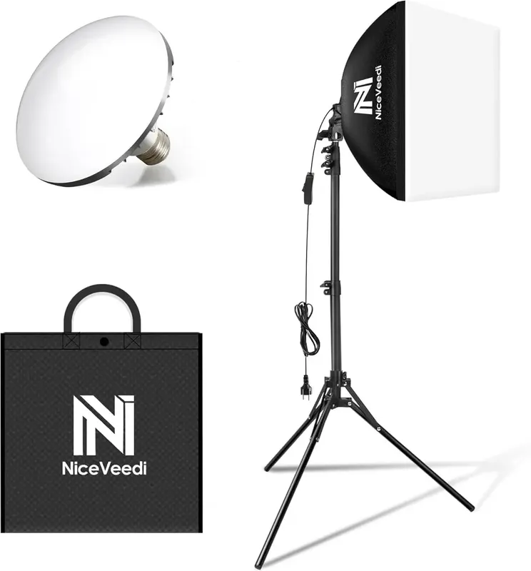 Комплект софтбокса NiceVeedi 16" x 16" с LED-лампой 5400K и штативом 150 см Компактный, но мощный софтбокс NiceVeedi — идеальное решение для фото- и видеосъёмки, прямых трансляций и контент-мейкинга. Оснащён антистробической светодиодной лампой с температурой света 5400K (эквивалент 450 Вт) для мягкого, равномерного освещения без мерцания. Размер 16 x 16 дюймов удобен для хранения и переноски. В комплект входит прочный трёхсекционный штатив с регулируемой высотой от 40 до 150 см и сумка для транспортировки. Подходит для портретной, предметной, фэшн- и рекламной съёмки. Преимущества: Яркая LED-лампа без мерцания (5400K) Компактный размер 40 x 40 см Прочный складной штатив (40–150 см) Подходит для 4K/60fps и 1080p/30fps без строба Лёгкая сборка и транспортировка Универсальное крепление 1/4" для камеры, телефона, GoPro