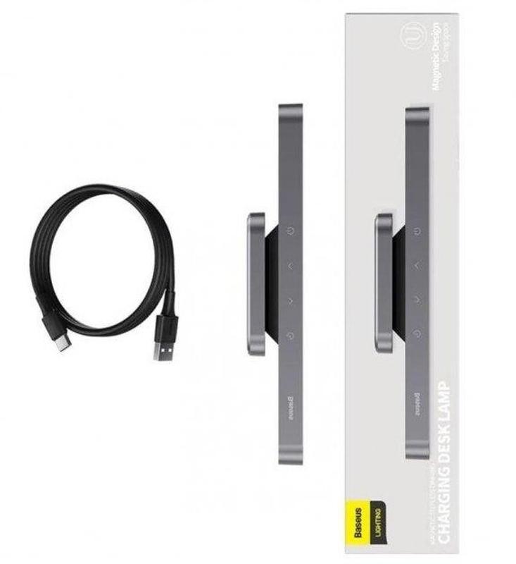 ОПИСАНИЕ ТОВАРА Светильник портативный магнитный Baseus Magnetic Stepless 4.5W DGXC-C0G имеет пластиковый продолговатый корпус следующих размеров: 274 х 35 х 42 мм. Кроме этого имеется дополнительная съемная панель с клейким основанием с одной стороны и со встроенной металлической пластиной с другой. Поскольку в корпусе самой лампы расположен магнит, то используя дополнительную панель лампы можно закрепить в разных местах и ​​положениях, наклон корпуса относительно дополнительной панели регулируется в диапазоне от 0 до 80 градусов. Мощность лампы составляет 5W Чего достаточно для обеспечения светового потока в 100LM, цветовой температуры 4000K, индекс цвета этой модели превышает 80 Ra. Настольная лампа Baseus DGXC-C0G имеет стандартное напряжение 5V, поэтому подключается к питанию обычным кабелем Type-C. Led лампа имеет аккумулятор емкостью 1800mAh, при максимальном уровне яркости энергии аккумулятора хватает на 4 часа работы лампы, а при минимальном на сутки. Сенсорные кнопки На корпусе лампы расположены четыре сенсорные кнопки: включение/выключение, увеличение яркости, уменьшение яркости, отключение с задержкой. Лед лампа Baseus DGXC-C0G имеет три уровня яркости (100%, 50%, 10%). Функция отключения с задержкой работает следующим образом, нужно нажать соответствующую кнопку, после чего свет лампы блеснет дважды и будет светиться еще следующие 30 секунд, после того, как это время пройдет свет погаснет. Это довольно удобная функция, например, в ситуации, когда вы собрались спать и вам просто нужно дойти из точки А в комнате до кровати, вам не придется прокладывать себе путь на ощупь в темноте.