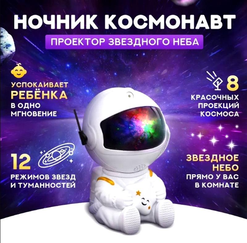 Проекционный светильник ночник, Светильник-проектор, Проектор небо для детей, NST Лазерный проектор звездное небо станет замечательным ночником для юных покорителей космоса, и одной из любимых игрушек! 8 ярких разноцветных изображений галактики оживят и украсят не только детскую комнату, но и вечеринку, семейный просмотр кино или игровую комнату. Разнообразие световых эффектов позволяет в полной мере ощутить великолепие звездного неба. Одним из главных преимуществ проектора является его подвижность. Вы можете придавать рукам астронавта различное положение и регулировать угол наклона головы. Тем самым Вы регулируете угол и направление проекции, так как проектирующая лампа находится в шлеме космонавта. Этот милый и забавный ночник станет настоящей изюминкой интерьера! Для максимального удобства ночник Астронавт оснащен пультом дистанционного управления с диапазоном действия 5 м и двумя режимами автоматического выключения - 45 минут и 90 минут. Вам не понадобиться вставать с кровати, чтобы выключить его, или лишний раз заходить в детскую, рискуя разбудить ребенка. Просто нажмите кнопку на пульте и выберите подходящий Вам таймер. Лазерный проектор Астронавт станет отличным подарком на День рождения или любой другой праздник. Он понравится и детям, и взрослым. Дарите звезды и делайте атмосферу в доме просто космической! Характеристики: - Материал корпуса: ABS пластик - Источник света: светодиодный светильник - Режим переключения: пульт дистанционного управления - Источник питания ночника: USB - Источник питания пульта: батарейки АА - Режимы свечения: 8 - USB Блок питания в комплект не входит - Мощность свечения: 5 Вт - Длина волны лазера: 532 НМ - Размеры: 12,5*8.5*8.5 см Комплектация: - 1 х проектор Астронавт - 1 х пульт дистанционного управления - 1 х USB кабель - 1 х инструкция Фото обзор:
