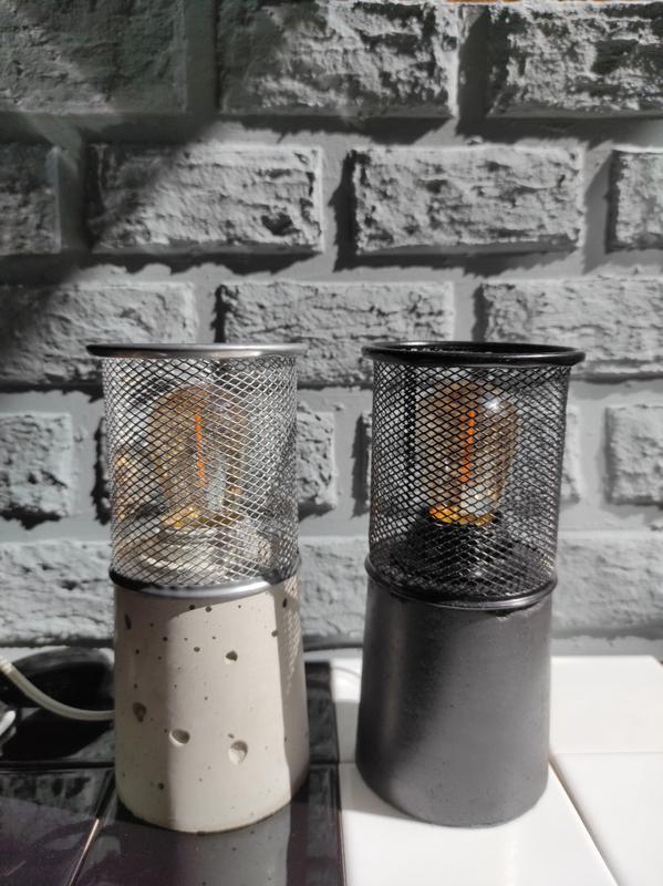 Светильник настольный из белого и черного бетона в стиле лофт. Создаст уютную атмосферу . Прекрасно подходит в качестве ночника. Украсит соответствующий дизайн интерьера. Ручная работа. Высота бетонного основания 9 см. Вся высота 19 см. Ширина 8 см. Длинна провода 1 м. Лампочка Эдисона Цоколь: Е27 Диаметр: 45 мм Высота: 90 мм Мощность: 1 Вт Температура света: 2200 К Световой поток: 100 Lm Колба: с бронзовым напылением. Лампа устойчивая , дно бетонного основания обеспечено фетровым материалом для избежания царапин поверхности , где будет стоять лампа. Бетонное основание вскрыто лаком.