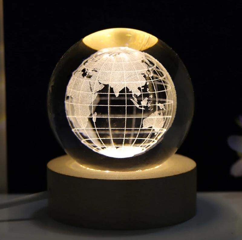 Светильник ночник подсветка "Кришталлическая Шар" выполнена из экологических материалов - дерева и стекла. Внутри стеклянного шара нанесена лазерная гравировка в виде Земли. База с однотонным теплым свечением. 3D ночник имеет размеры: - Диаметр шара: 6 см; - Высота подставки: 2 см. Работает светильник от USB-шнура. Ночник - подсветка стеклянный шар отлично подойдет для детской комнаты, спальни или кабинета. Декоративный мини светильник "Земля" - отличный подарок на день Рождения, Новый Год, новоселье: близким людям, избирательному другу, коллеге по работе.