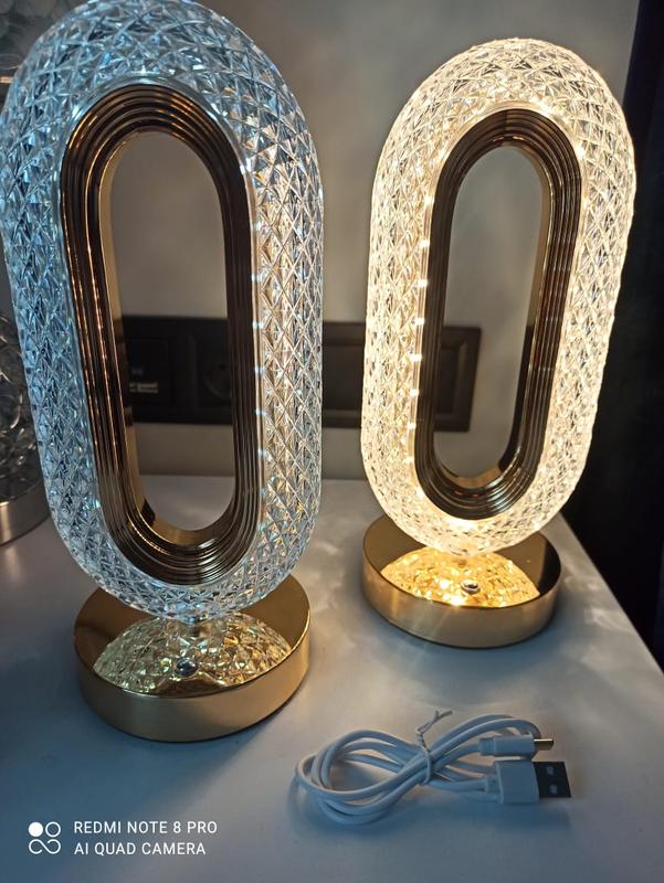Витончена форма світильника нічника імітує кришталь і створює неповторне гарне свічення. Лампа виготовлена із акрилу з елементами металу. Стильний декоративний світильник має три різні змінні кольори: холодний, теплий, нейтральний. Прекрасний дизайн створює романтичну розслаблюючу та приємну атмосферу для вас і стане чудовим доповненням у Вашій оселі, тому що він створює відчуття комфорту та затишку. Лампу можна заряджати через USB-порт, що робить її практичною та простою у використанні. Опція регулювання яскравості дозволяє регулювати інтенсивність світла відповідно до ваших потреб.