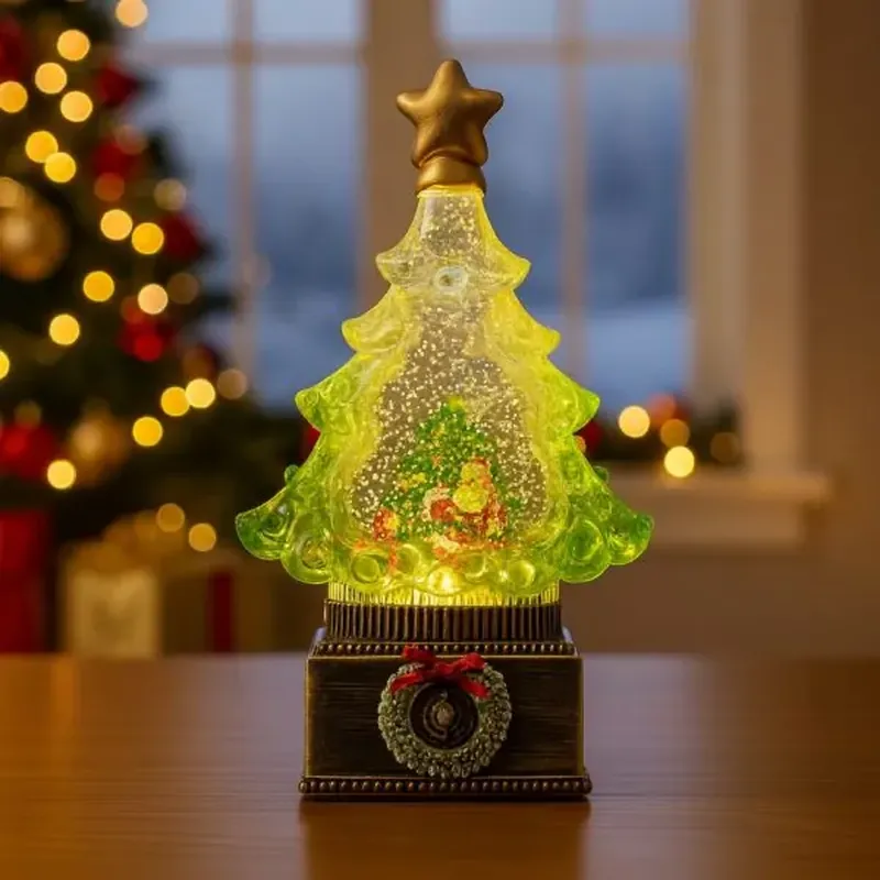 Описание: Погрузитесь в атмосферу настоящего рождественского чуда с этим уникальным светильником-декором! Это не просто "снежный шар", а целая сказочная композиция, выполненная в виде украшенной елки на винтажной бронзовой подставке. Внутри прозрачной елочки скрыта миниатюрная сцена: Санта-Клаус возле своей елки. Но настоящее волшебство начинается при включении: Встроенный механизм создает эффект "снегового вихря", и тысячи мерцающих блесток начинают кружить в воде, создавая заколдованную заметиль. Мягкая LED-подсветка освещает эту сцену изнутри, превращая сувенир в волшебный ночник. Этот светильник станет центральным элементом вашего праздничного декора или запоминающимся подарком для близких. Ключевые преимущества: Уникальный дизайн: Выполнен в форме елки, а не классической пули. Эффект "Бабочки": Автоматический вихрь из блесток создает динамику. Мягкая подсветка: Создает тепlu и уютную атмосферу в комнате. Винтажный стиль: Бронзовая подставка с рождественским венком выглядит дорого и стильно. Идеальный подарок: Готовое решение для подарка на Новый Год и Рождество. Характеристики: Тип: Новогодний светильник / Снежный шар / Водяной шар Форма: Ялинка Эффекты: Подсветка (LED), вихрь блесток (заметиль) Сцена внутри: Санта-Клаус с елкой Материал: Пластик, акрил, вода Питание: от батареек Цвет корпуса: Зеленый / Бронзовый Модель: XHF-8003
