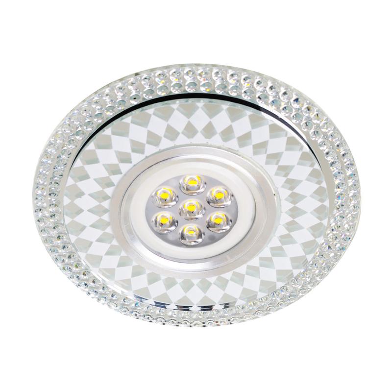 Светильник точечный встроенный HDL-G310 MR16+3W LED предназначен для подсветки жилых помещений с интерьерами в современном и классическом стиле. Такие модели можно устанавливать в гостиной, на кухне, в коридоре и прихожей. Каркас изделия изготовлен из металла, декорирован рельефными стеклянными элементами. Это встраиваемый точечный светильник. Он имеет металлические крепления для монтажа в подвесные и натяжные потолки. Дополнительно светильник оборудован светодиодной подсветкой. Мощность ЛЕД подсветки 3 Вт. Для работы осветительного прибора нужна одна лампочка с цоколем GU5.3 мощностью до 40 Вт. Это лампа MR16 с многогранным отражателем (Multifaceted Reflector). Точечный светильник имеет круглую форму, его можно использовать только для освещения помещений.