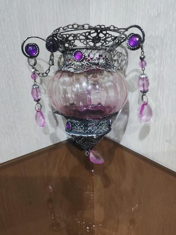 подвесной плафон винтажный на подставке, очень красивый, фото не передает красоту, стекло розовое с сиреневым оттенком, металл сетевой, пластик