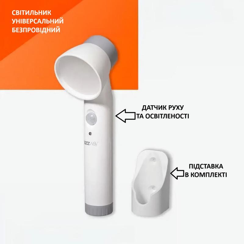 Светодиодный фонарь-светильник с датчиком движения и освещенности Хорошая автономность работы на батарейках, отсутствие необходимости прокладки проводов, разнообразие способов фиксации позволяют использовать светильник во многих местах, где необходимо подсветка, но отсутствие стационарного освещения: в шкафах, воротничках, гардеробных, на кухне, в гаражах и т.д. Компактность, легкость, экономичность позволяют использовать универсальный светильник в качестве фонаря: дома, на даче, в палатке, в автомобиле и т.д. Два режима работы: постоянное свечение и автоматическое включение В автоматическом режиме при появлении движущегося объекта в области «видимости» датчика движения происходит включение фонаря. Второй обязательным условием включения является недостаточный уровень освещенности. Дистанция срабатывания до 3 метров, диапазон обнаружения 120 градусов, отключение через 30 секунд Цветовая температура 6000 – 7000 К В комплект поставки входит лента-липучка, которая позволяет закреплять подставку-держатель на гладких поверхностях