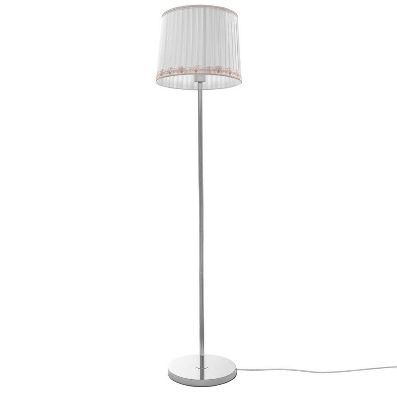 Торшер приліжковий з абажуром BKL-656F/1 E27 CH призначений для вітальні, спальні, кабінету. Його можна поставити біля дивана чи крісла у вітальні, в домашньому кабінеті в зоні відпочинку або в спальні поруч з ліжком. Модель виготовлена з металу і тканини. Конструкція включає круглу металеву основу кольору хром, пряму ніжку і тканинний абажур білого кольору з золотистим декором. Абажур приглушує світловий потік, робить освітлення м'яким і приємним. Для роботи торшера необхідна одна лампочка з цоколем Е27. Підійде лампа розжарювання, енергозберігаюча або світлодіодна. Вимикач знаходиться на шнурі.