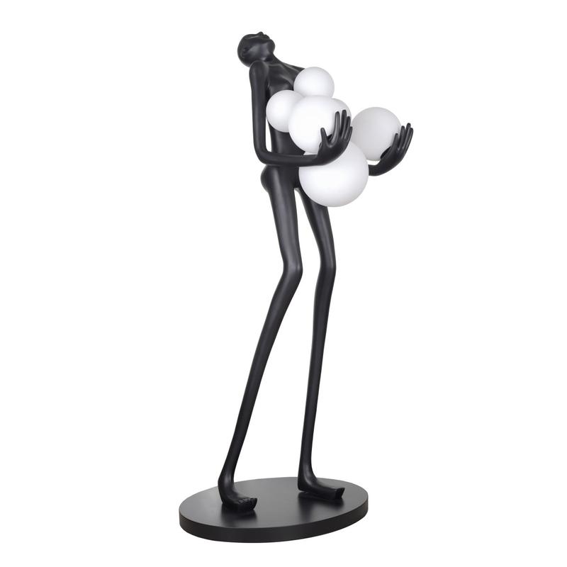 Торшер людина з кулями FLT-55F/6 E27 - це справжній витвір мистецтва, який стане окрасою будь-якого простору. Торшер поєднує в собі скульптуру та оригінальний освітлювальний прилад, який не залишиться непоміченим у вітальні, торговому центрі, готелі чи ресторані. Людина тримає в руках шість куль, які є джерелами освітлення. Вони створюють оригінальну гру тіней для всього об'єкта, підкреслюючи лінії фігури та освітлюючи кімнату на всі боки. Довжина шнура становить 1500 мм, що дозволяє встановити торшер у будь-якому місці. Для максимальної зручності передбачена кнопка увімкнення-вимкнення. Скляні плафони різного діаметру оснащені цоколем Е 27, який ідеально підходить для світлодіодних, галогенних та енергозберігаючих лампочок. Найкращим варіантом тут стануть LED лампи потужністю 60 Вт. Торшер має висоту понад 1800 мм, тому чудово підходить для акцентування певної ділянки кімнати. Для стійкості виробу передбачено зручну круглу підставку діаметром 750 мм.