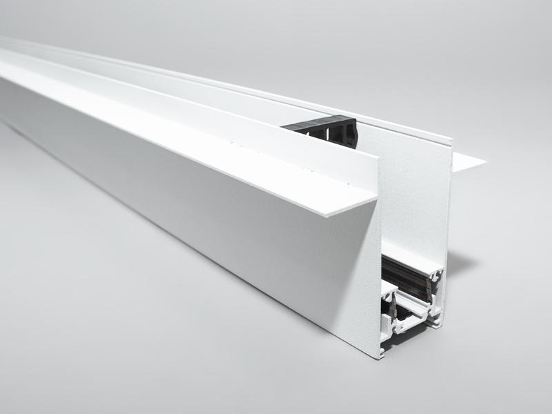 Шинопровод для магнитной трековой системы специально разработан для скрытого монтажа. Трек не выступает из поверхности потолка или стены. Монтаж треков данного типа выполняется на этапе сборки каркаса для гипсокартона. С тыльной стороны крылышек трека подводятся торцы CD-профиля, и прикручиваются через трек саморезами по металу. Затем на наружную поверхность крыльев укладывается лист гипсокартона и притягивается также саморезами по металу. Шинопровод состоит из двух пар проводников. Одна пара для питания светильников. Вторая, резервная, для подключения управления светильниками, например, с помощью контроллеров стандарта DALI. Шинопровод рассчитан на использование напряжения питания 48в. В конструкции использованы шины прямоугольного сечения, которые обеспечивают большую площадь сечения проводника, и лучший контакт, чем шины с круглым сечением. Благодаря использованию стандартного профиля для системы 48в, можно комбинировать треки и светильники разных производителей в одной системе.