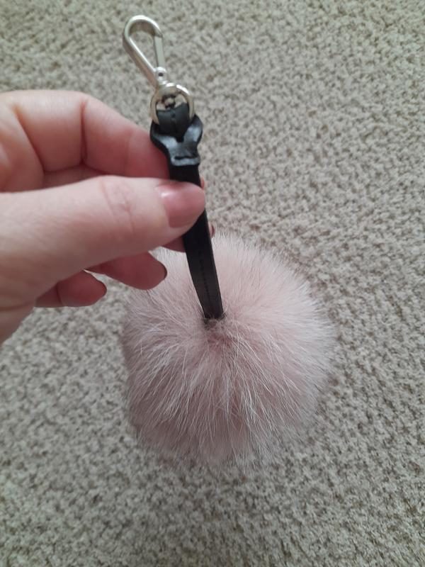 Підвіс із хутра песця, ніжно-рожевого кольору, не був у використанні. Карабін не розкривається достатньо широко, щоб повісити його на більшість сумок. За час зберігання трохи прим'явся. Зберігався в оригінальній коробці з магазину "Bags etc.".