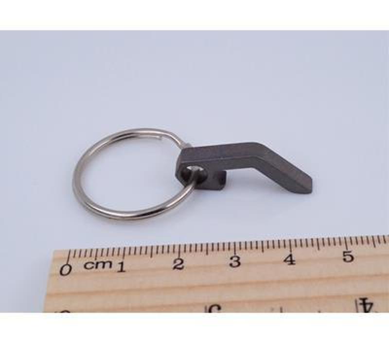 Брелок-открывашка для ключей из титанового сплава. Размеры: длина общая 4,80 см., вес 3.45 грм., диаметр металлического кольца 2,50 см.