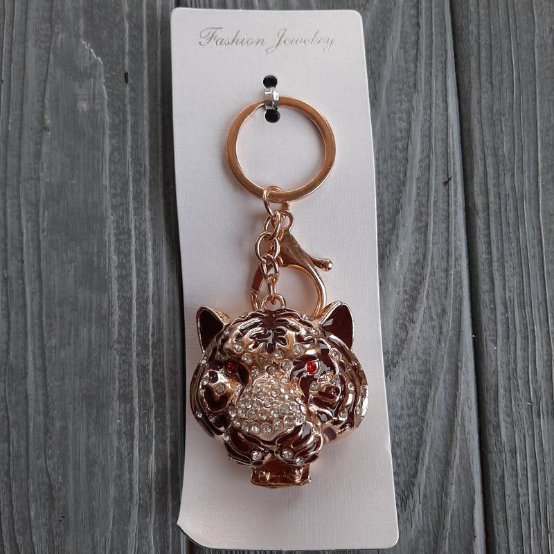 Брелок тигр розовое золото со стразами, брелок голова тигра, стильный брелок для ключей