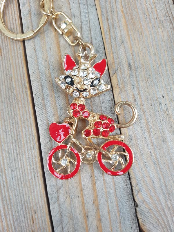 Брелок киса на велосипеде в очень хорошем состоянии. Отсутствуют два светлых и один красный камешек.